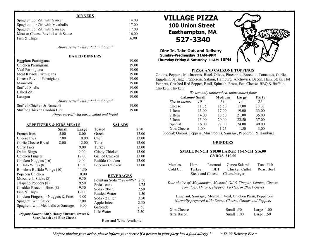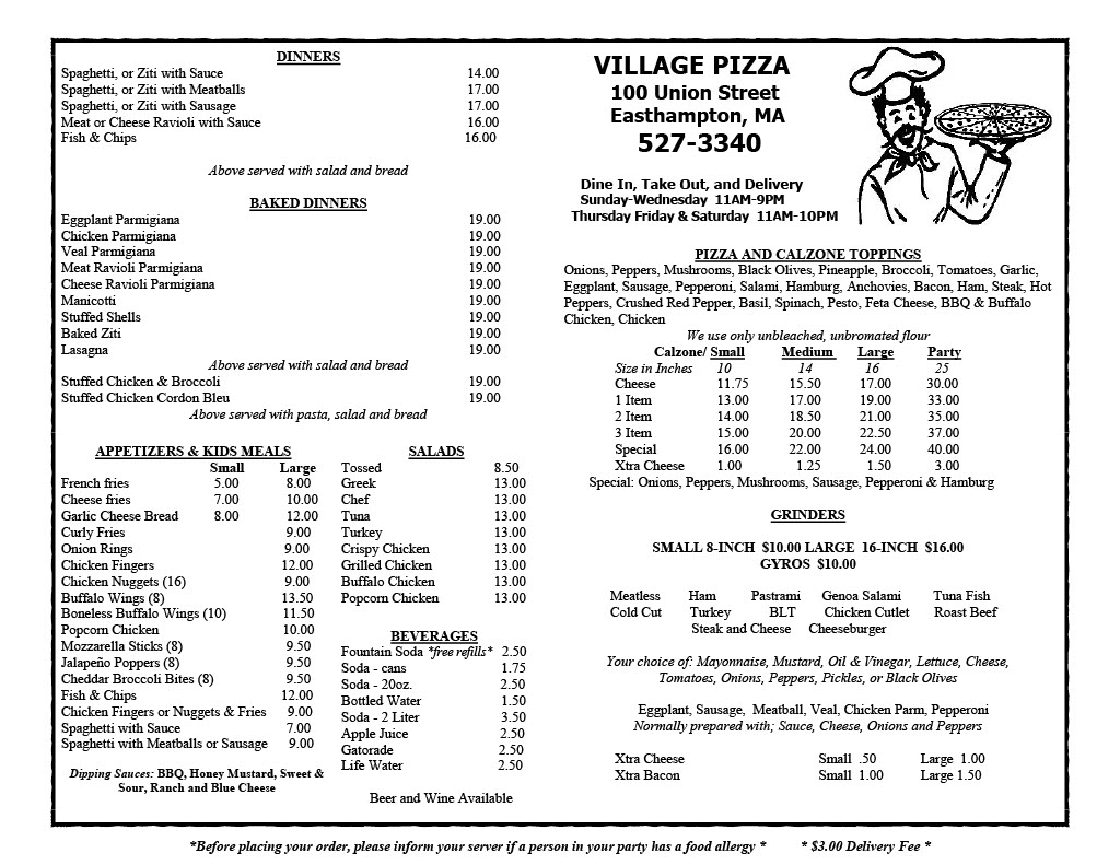 The menu at Easthampton Village Pizza offers a straightforward and comforting selection that fits well with the casual, family-friendly vibe of the restaurant. It features classic pizza options like cheese and double pepperoni with bacon alongside a variety of baked dinners, from hearty lasagna to chicken parmigiana. This simple yet satisfying approach makes it a great spot for relaxed meals, whether you’re stopping by for takeout or settling in for a casual dinner with friends or family.